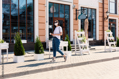 woman, young, caucasian, face mask, prevention, pandemic, quarantine, distance, protective, youth, walk, beautiful, street, city, prevent, enjoy, safety, relax, brunette, alone, eyeglass, listen, mobile, smartphone, person, work, device, phone, earphones, face, happy, female, morning, 1, care, business, active, urban, girl, shop, leisure, lifestyle, concept, vacation, city landscape, hot drink, mask, europa