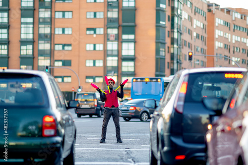 solo, performer, juggling, pin, surrounded, car, street, city, 1, people, adult, man, outdoors, day, spain, artist, club, madrid, motion, uniform, work, wear, mature, road, motor, vehicle, caucasian, skill, performance, male