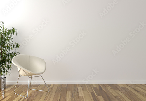 Solo white chair, interior plant and blank wall in background
