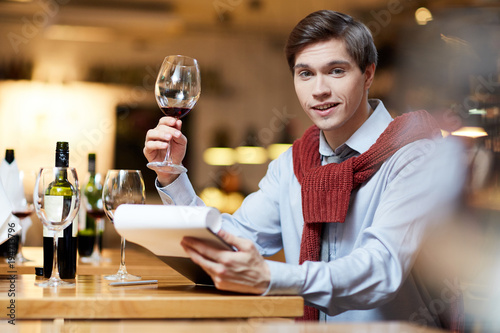 business, businessman, man, person, young, adult, job, specialist, profession, professional, occupation, eatery, cafes, bar, wine glass, wine, red, sommelier, contemporary, drink, beverage, glasses, alcoholic, winery, quality, favor, expert, expertise, stemware, bottle, sort, compare, learning, working, reading
