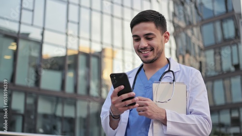 doctor, health care, professional, medicals, staff, hospital, smartphone, use, workplace, setting, communication, device, waiting, area, stethoscope, scrub