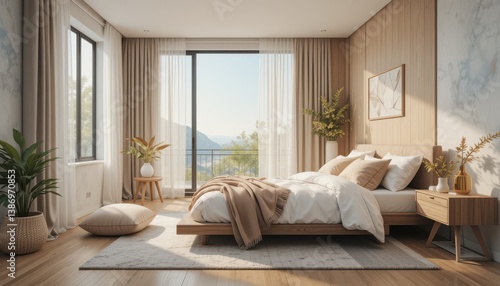 Sophisticated bedroom interior with minimalist wooden design and natural light