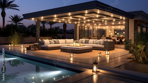 Sophisticated desert villa at night with softly lit pool, sand-colored patio tiles, dark olive green outdoor sofa set, and glowing orbs placed around lounge zone
