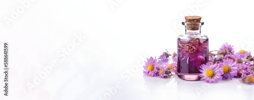 Sophisticated Essential Aster Oil in Glass Bottle with Fresh Aster Flowers isolated on white, copy space, banner, Generative AI