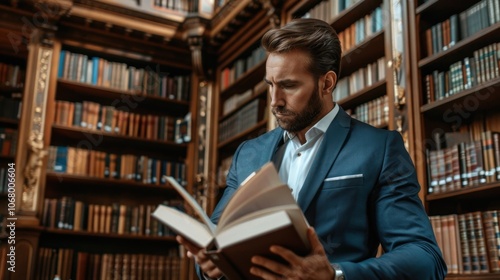Sophisticated Library Setting: A man in elegant attire peruses a book in a grand library, soft, warm lighting enveloping him, showcasing his calm intelligence and charm.