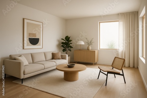 Sophisticated minimalist living space with high ceilings and harmonious green-white color palette