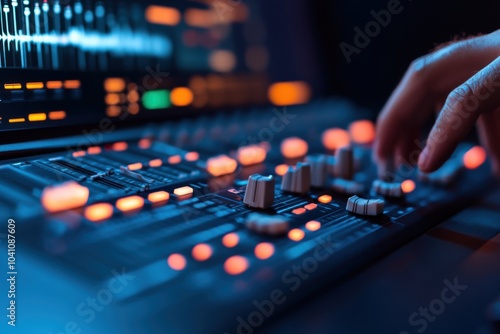 audio, mixing, board, sound, engineer, studio, music, recording, dj, producer, console, equipment, technology, soundboard, electronic, entertainment, professional, control, buttons, knob, fader, level, adjust, volume, mix, master, track, song, album, creative, industry, nightlife, club, concert, live, performance, design, audiophile, musician, artist, band, cinematic, blue, orange, light, dark