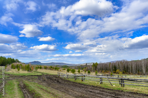 South Ural farm, wooden fence and arable land with a unique landscape, vegetation and diversity of nature.
