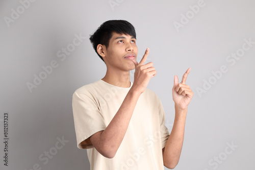 adolescence, teenage, student, children, boy, person, lifestyle, male, one person, man, portrait, young, asian, guy, adult, casual clothes, college, youth, high school, background, confident, attitude, pose, studio, photogenic, front view, rear, pointing, showing, finger, hand, gesture, direction, signs, arm, commercial, shopping, online, cyberspace, invitation, greeting, welcome, eatery, store, client, service