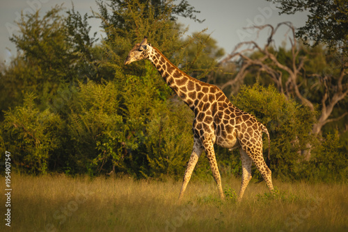 Southern giraffe walking past trees and bushes