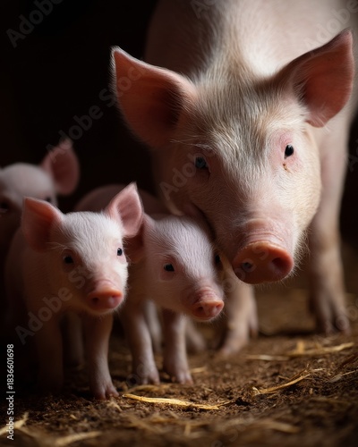 pig, baby pig, sow, farming, agricultural, farm animal, motherhood, barn, mammal, stable, animal, nature, rural, cute, young, domestic, care, breeding, pork meat, meat, straw, hay, dark background, portrait, group, adorable, innocence, protection, wildlife, animal husbandry, farm animal, animal portrait, animal welfare, farm, pink, baby pig, agriculture, snout