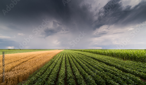 agriculture, bean, crop, cultivated, farm, farming, field, food, green, growing, growth, horizontal, in a row, industry, landscape, leaf, monoculture, nature, nobody, plant, rural, rural scene, sky, soy, soybean, summer, vegetable, young, storm, cloud, wheat, gold, yellow