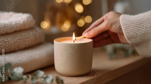 Spa Day Calmness Hand Lighting Candle for a Tranquil Atmosphere with Soft Towels and Warm