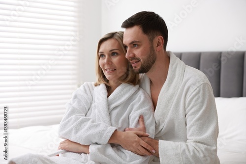 Spa. Happy couple in bathrobes sitting on bed indoors