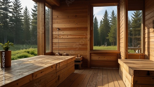 space with large windows showcasing the surrounding nature. Wooden planks and beams create a warm, inviting atmosphere.