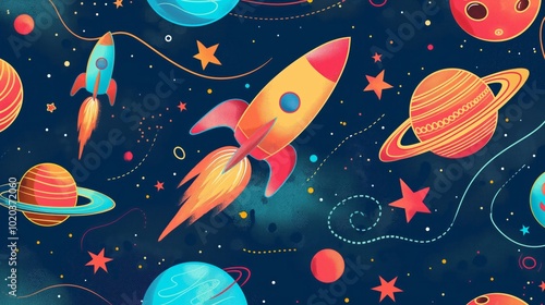 space, spaceship, rocket, planet, universe, galaxy, exploration, adventure, seamless, pattern, design, texture, illustration, colourful, vibrant, playful, star, cosmos, celestial, science, fiction, fantasy, childlike, whimsical, repeating, tileable, surface, fabric, wallpaper, scrapbooking, digital, art, drawing, cartoon, graphic, vector, futuristic, travel, discovery, technology, modern, creative, imaginative, cosmic, interstellar, astronomy, outer, alien
