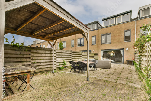 backyard, patio, pergola, residential, building, wide, view, roomy, comfort, home, exterior, paving, stone, brick, house, architecture, garden, table, chair, wooden, fence, urban, seating, area, deck, dining, relaxation, leisure, lifestyle, property, suburb, domestic, environment, terrace, living, space, real, estate, couch, plant, design, open, air, neighbourhood, row house, family, homelike, greenery