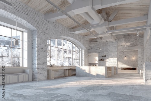 loft, open, space, modern, industrial, brick, wood, window, light, bright, sunlit, interior, design, architecture, contemporary, large, high, ceiling, rustic, cosy, kitchen, living, area, snow, mountain, view, clean, minimalist, neutral, warm, white, grey, stone, floor, beam, furniture, simple, decor, empty, empty space, sunlight