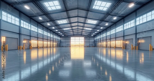 industrial, warehouse, interior, architecture, minimalist, natural light, reflections, bright, airy, empty, large, space, commercial, steel, metallic, modern, construction, building, storage, facility, expo, factory, indoor, distribution, workshop, concrete, floor, perspective, center, shop, hangar, daylight, glass window, structure, wall, nobody, business, design