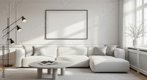 Spacious living room with a large white sectional sofa, coffee table, and a floor lamp, bathed in natural light from a large window