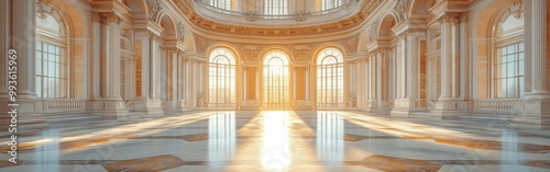 Spacious marble hall with towering columns, arched ceilings, and streaming sunlight
