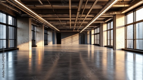 Spacious modern empty dance studio with large illuminated by warm afternoon sunlight