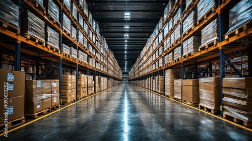 spacious warehouse features tall shelves filled with stacked boxes, illuminated by overhead lights