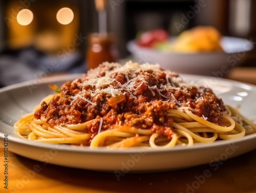 Spaghetti Bolognese in a Plate. Generative AI illustration.