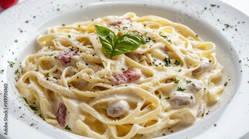spaghetti carbonara on a white plate in a restaurant