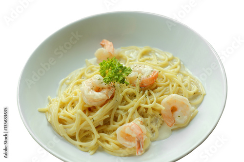 Spaghetti Carbonara or white cream sauce pasta with shrimp.