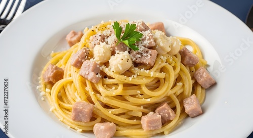 Spaghetti carbonara served on a white plate