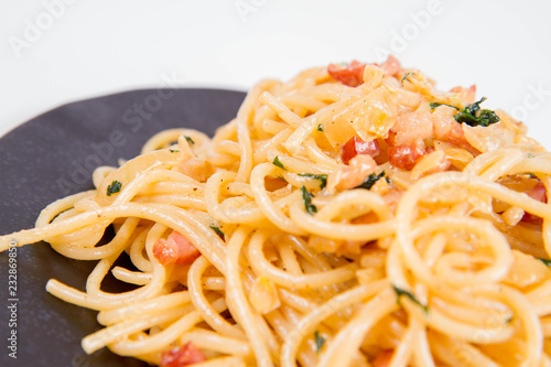 Spaghetti Carbonara with some parsley on a black plate on a white background