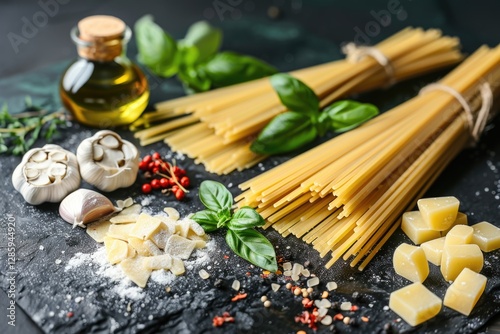 Spaghetti, garlic, basil, parmesan cheese, and olive oil ready for a delicious pasta dish.