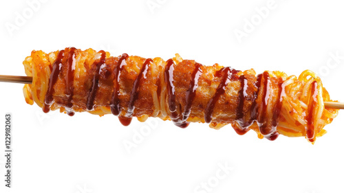 Spaghetti on a stick coated in sweet sauce captured at a food festival in a vibrant outdoor setting