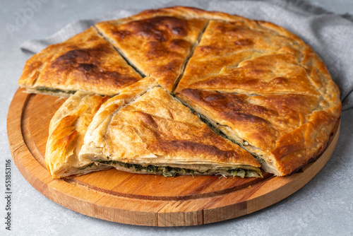 Spanakopita, greek phyllo pastry pie with spinach and feta cheese filling. Delicious handmade pies. Turkish name; el acmasi borek