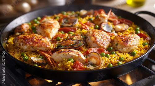 chicken, spanish, paella, saffron, rice, seafood, pea, frying pan, savoury, flavorful, vibrant, traditional, aromatic, hearty, delicious, rich, indulgent, comforting, festive, colourful, authentic, filling, satisfying