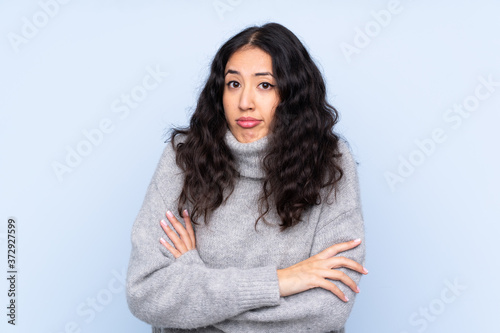 Spanish Chinese woman over isolated blue background making doubts gesture while lifting the shoulders
