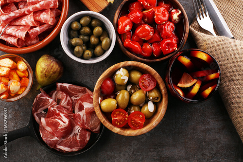 spanish tapas and sangria on wooden table - mediterran antipasti set
