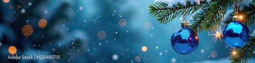 Sparkling blue glass ornaments hanging from a snow-covered fir tree branch, festive decor, holly, shine