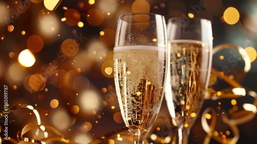 Sparkling Champagne Glasses Against Blurred Background with Shimmering Bokeh and Festive Elements