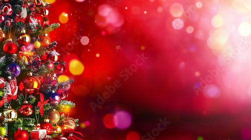 Sparkling Christmas Tree with Vibrant Ornaments Against a Festive Red Background, Perfect for Holiday Greetings and Winter Wonderland Designs.