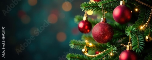 Sparkling ornaments hang from the branches of a Christmas tree, shimmering garlands, colorful balls, bows