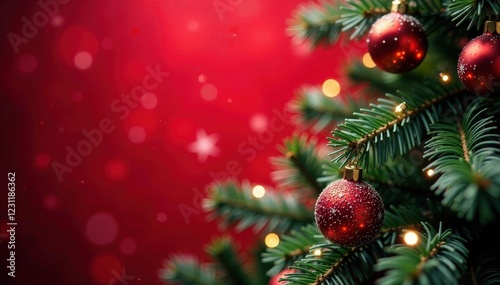 Sparkling snowflakes on a crimson red Christmas tree backdrop, festive atmosphere, christmas tree lighting