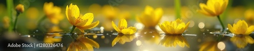 Sparkling water droplets on yellow rapeseed petals reflected in a tranquil puddle, landscape, serene