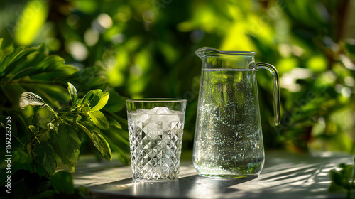 Sparkling water in clear glass and pitcher with blurred green leaves backdrop