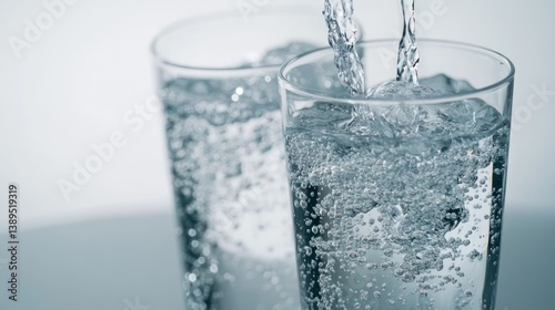 Sparkling water pouring into glasses, studio shot, refreshment, advertising