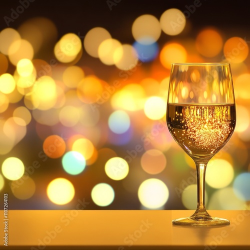 Sparkling wine glass on table with blurred lights background.