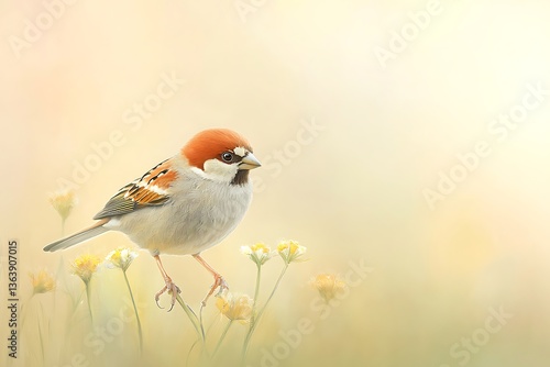 sparrow, bird, spring, meadow, sunrise, flower, nature, wildlife, animal, avian, fauna, springtime, dawn, blossom, floral, small bird, field, yellow flower, soft light, serene, calmness, gentle, soft focus, macro, closeup, background, wallpaper, artwork, illustration, digital artwork, image, photograph, pretty, cute