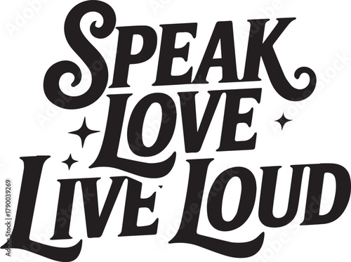 Speak Love Live Loud retro script lettering with starbursts typography vintage
