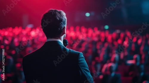 speaker, audience, conference, presentation, stage, red, lighting, blue, dark, suit, back, view, event, business, meeting, large, crowd, public, speaking, performance, professional, corporate, seminar, lecture, dais, microphone, spotlight, dramatic, atmosphere, dimly, lit, blurred, massa, people, rear, man, attire, address, hall, convention, center, venue, indoor, night, formal, speech, talk, communication, leadership